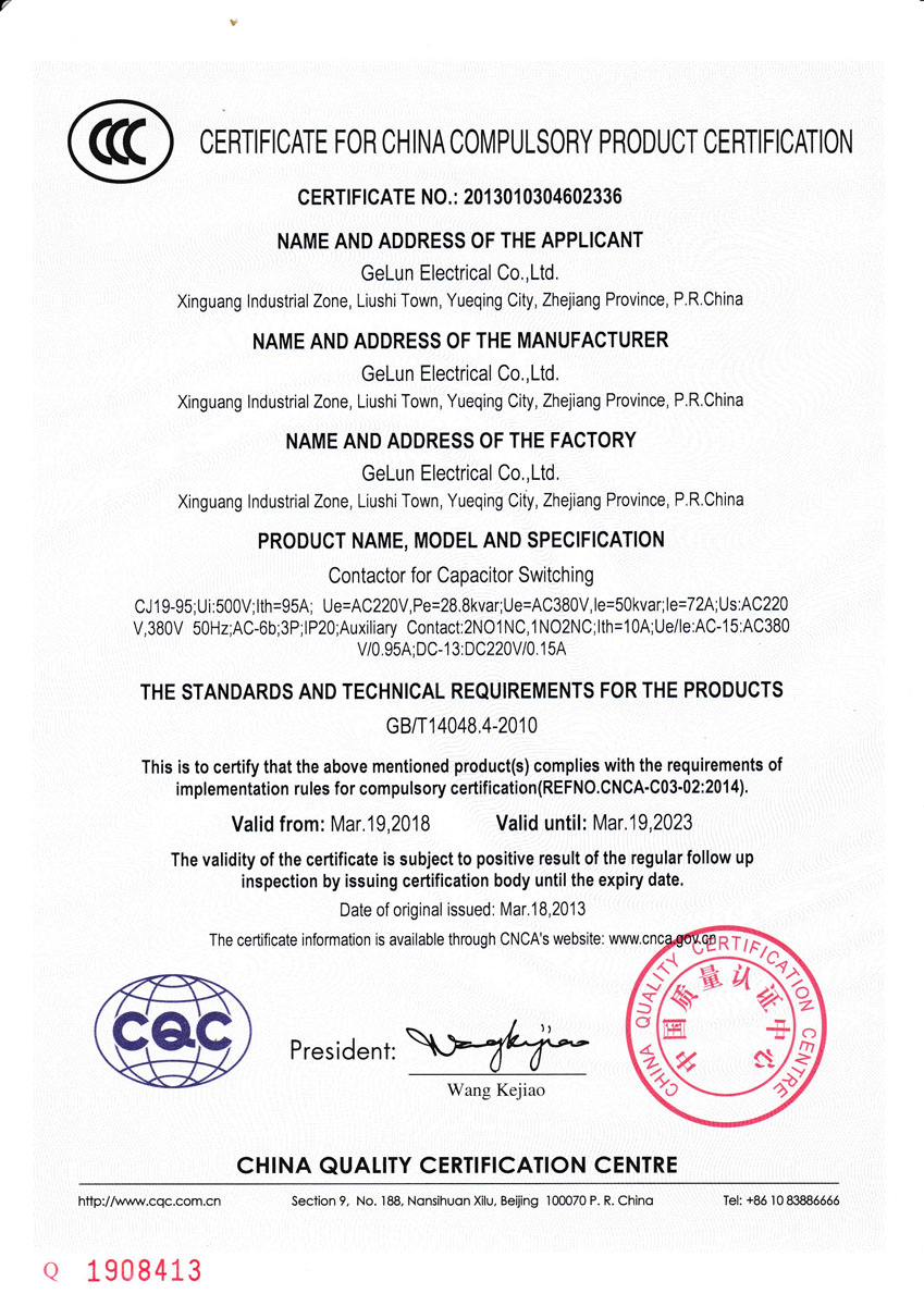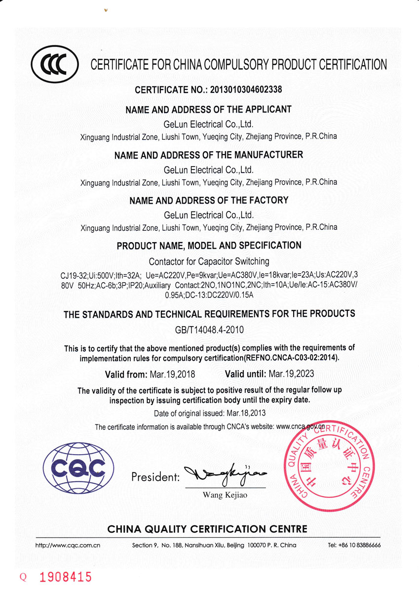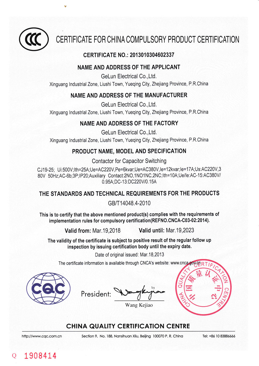 CJ19 series switching capacity contactors are mainly used in AC 50Hz or 60Hz, rated working voltage up to 380V, rated power up to 50kvar power system. It is used to turn on/off parallel capacitors, in order to improve the power factor.